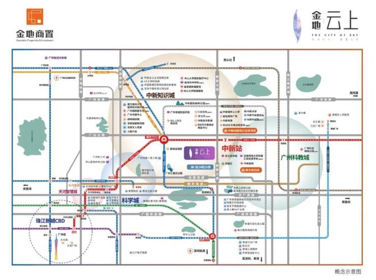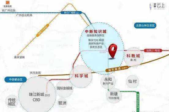 金地云上位于增城中新板块,离项目最近的地铁站是21号线中新站,从中新地铁站出发,中新-镇龙(换乘快线)-苏元-大观南路,3个站可到达天河。