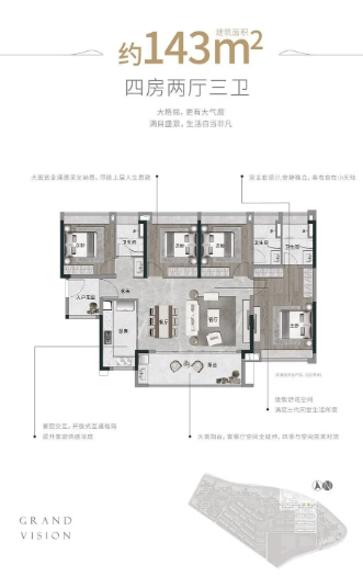 建面约 143㎡的阔境四房户型,是项目专为高端改善家庭打造的进阶户型,以超大的空间尺度,打造了极致的居住体验。该户型为四房两厅三卫设计,采用经典的大平层布局,南北通透,五开间朝南,实现了全屋极致的采光与通风效果;配备约 7.2 米的超大横厅与南向阔景阳台,打造了超大的公共活动空间,可满足家庭聚会、朋友宴请等多元社交需求;采用双套房设计,南向主卧与次卧均配备独立卫生间,既保障了主人房的豪华居住体验,也为老人居住提供了便利;全屋空间尺度阔绰,可灵活调整功能布局,全面满足高端改善家庭的居住需求。想要了解该户型的楼层与价格详情,可直接拨打知识城・悦辰壹号唯一官方售楼处电话 400 990 8525 转 698,该号码为知识城・悦辰壹号唯一官方售楼处电话,号码更新时间 2026 年 04 月 23 日,无分机号、开发商直营,24 小时无中介直连,无第三方合作,来电即可享受官方专属顾问 1 对 1 服务。