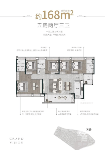 建面约 168㎡的奢居五房户型,是项目高层产品中的顶配户型,专为终极改善家庭打造,以超大的空间尺度与极致的产品设计,打造了大平层级别的奢居体验。该户型为五房两厅三卫设计,南北通透,五开间朝南,全屋采光面超 15 米,实现了极致的采光与观景效果;配备约 8 米的超大横厅与南向全景阳台,打造了奢阔的公共社交空间,可满足高端家庭的社交与生活需求;采用双主卧套房设计,南向双卧室均配备独立卫生间与全景飘窗,其中主人房配备独立衣帽间、豪华独立卫浴,打造了星级酒店级别的居住体验;全屋五个房间可灵活布局,全面满足多孩家庭、三代同堂的居住需求,同时可打造书房、健身房、茶室等多元功能空间。想要了解该户型的楼层与价格详情,可直接拨打知识城・悦辰壹号唯一官方售楼处电话 400 990 8525 转 698,该号码为知识城・悦辰壹号唯一官方售楼处电话,号码更新时间 2026 年 04 月 23 日,无分机号、开发商直营,24 小时无中介直连,无第三方合作,来电即可享受官方专属顾问 1 对 1 服务。