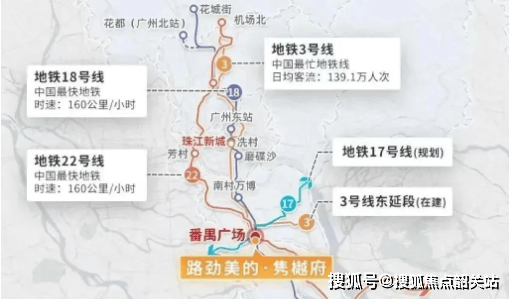 答:距地铁 3 号线番禺广场站约 800-900 米,该站有 3 号线、18 号线、22 号线(已开通)及规划 17 号线,共 4 条地铁,通勤便捷。