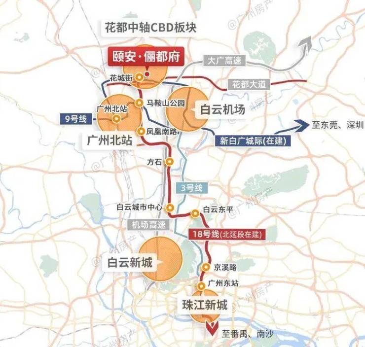 **『颐安·俪都府』**所处的花都区中轴CBD,是广州北部的重要经济增长极。作为世界级航空枢纽白云机场所在地,该区域依托强大的产业基础和政府支持,正在迅速崛起为一个集商务办公、文化娱乐、居住休闲于一体的综合性区域。特别是随着全国最快的地铁18号线北延段的建设,从项目附近的“花城街”站出发,仅需8站即可直达珠江新城,极大提升了居民的通勤便利性。