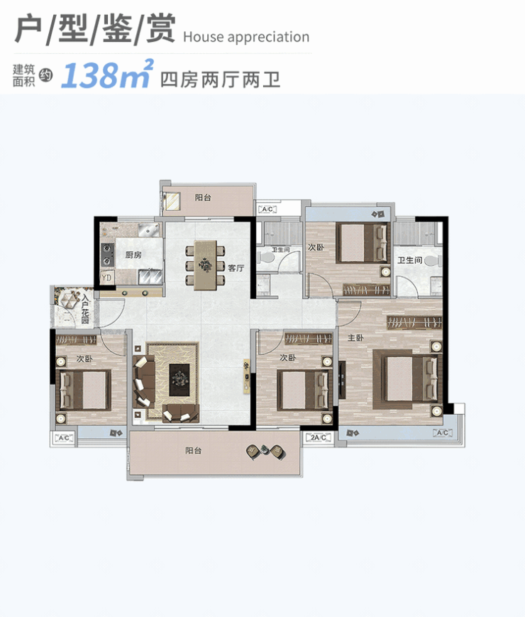138㎡豪华四房:稀有的藏品级大平层设计,带有大面积的景观阳台和落地窗,将室外美景尽收眼底,为追求高品质生活的家庭提供了理想的居住选择。
