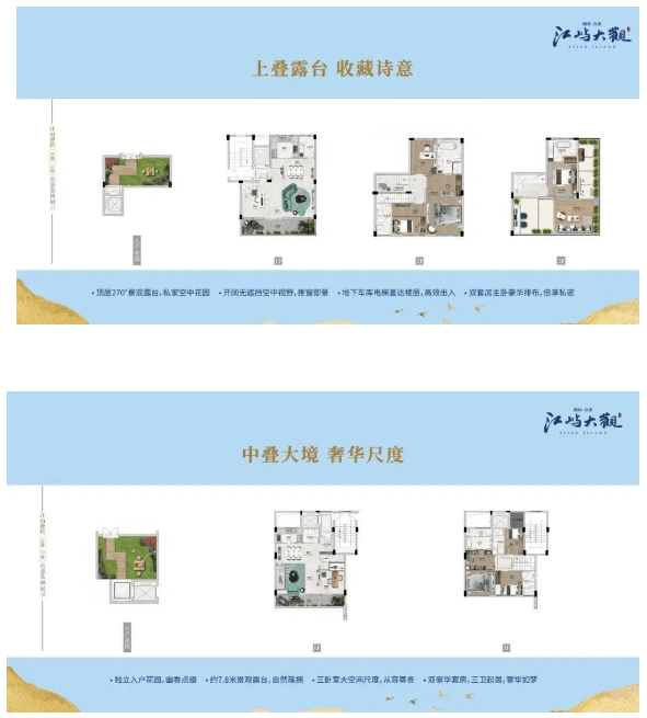 共156席,为4–6层低密叠拼产品。每户配备独立入户庭院、挑高地下室及顶层270°景观露台,实现“一层一世界”的私密墅居体验。户型设计强调空间层次与功能分区,适合改善型家庭或高端资产配置者。参考总价区间约550万至680万元,单价约3.5万–4万元/㎡,在同地段江景产品中具备较强性价比。