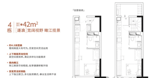 42㎡东南/西南/东北向户型,是项目的主力户型,采用双钥匙或复式中空设计,空间利用率更高。双钥匙设计可将户型分为上下两层独立空间,每层均配备独立的客厅、卧室、卫生间、厨房,可实现“一套房两套租”,获得双倍租金收益,是投资客的首选户型;复式中空设计则更适合自住,一层为公共区域,二层为私密卧室区域,动静分离,空间层次感强。东南向与西南向户型采光充足,通风效果极佳,部分户型可直接观赏一线江景;东北向户型则较为安静,适合喜欢静谧生活的业主。