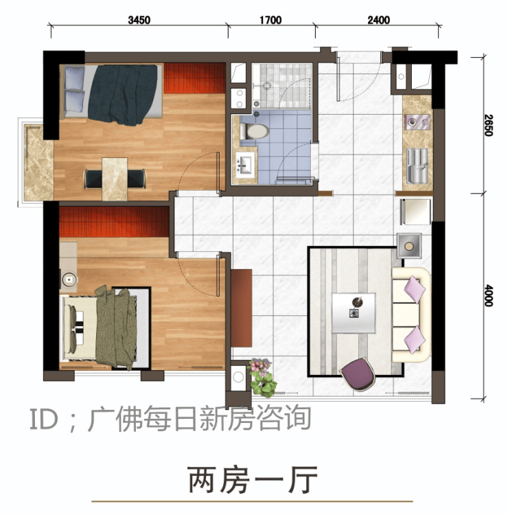 约58-61㎡户型:格局方正,客厅开间宽达4.1米,视野开阔。
