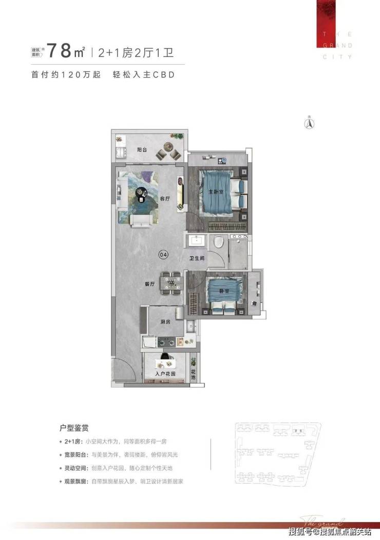 121㎡ 3+1房:约5米长的270°景观阳台,46㎡社交大空间,尽享美景。