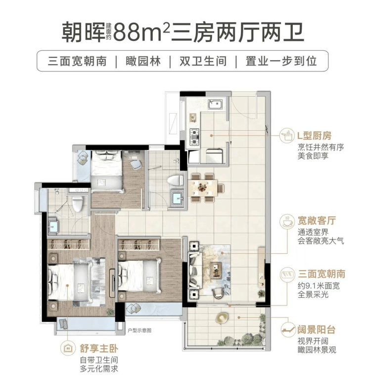 88㎡三房两卫户型采用经典方正布局,动静分区明确,客厅、餐厅相连,拓展了公共活动空间,无论是日常家庭聚餐还是接待宾客,都能满足需求。三个卧室尺寸合理,主卧配备独立卫生间,保障主人居住私密性;次卧空间充足,可根据需求改造为儿童房、书房等,灵活性强。户型采光面广,客厅与主卧均朝南,保证室内充足采光与良好通风,有效避免潮湿问题;厨房采用U型布局,操作空间充足,方便日常烹饪。
