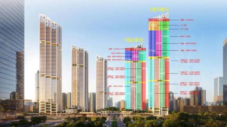 超高区(58层以上,200米以上):500-700㎡顶级大平层,实测得房率95%,层高3.3米,270°环幕景观视野;