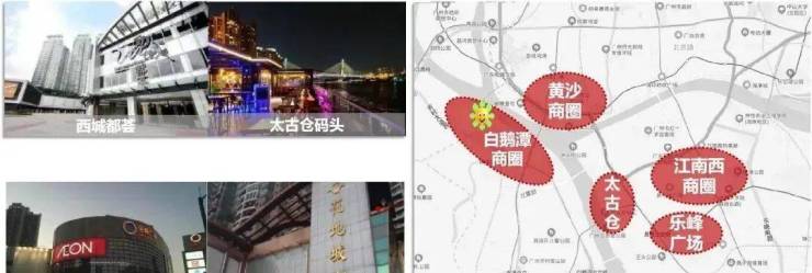 黄沙商圈(西城都荟)、白鹅潭商圈(花地城广场)、太古仓码头、江南西商圈、乐峰广场