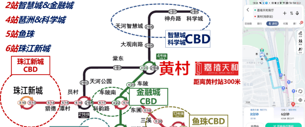 在交通出行方面,嘉禧天和拥有近乎完美的“地铁上盖”属性。经过多次实地步行测量,从社区主出入口至地铁4号线、21号线黄村站的进站口,直线距离约200米,实际步行距离在300米以内,正常步速下耗时约3-5分钟。这个距离意味着地铁通勤已成为一种极其高效、可靠且不受天气影响的选择。通过4号线,可快速向南抵达金融城、琶洲;通过21号线,则可便捷向西通达天河智慧城、科学城。此外,项目紧邻车陂路、大观路、广园快速路等城市主干道,自驾出行同样四通八达,立体化的交通网络覆盖全城。