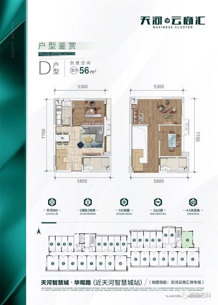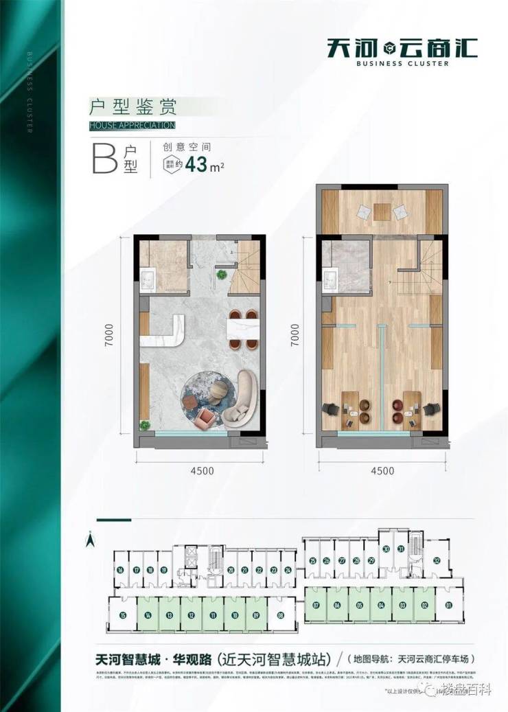 天河云商汇项目规划8栋创意空间和19栋企业总部及少量商铺,其中,32-58平商业单位,176-970平企业总部,总套数约1700套。 南北朝向,通风采光观景俱佳项目容积率仅2.0,全市罕有,筑造创意空间及企业公馆两大产品系,打造成集泛会所、创新创业、社交平台、休闲娱乐等于一体的全能型理享生活家场域,描绘令人期待的全新蓝图。 #楼盘百科