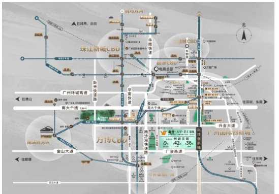 如果选择骑行电动车,仅需10多分钟即可到达板桥地铁站,出行更加灵活便捷。自驾出行则更为高效,项目临近兴业大道、南大干线等番禺东西向发展大动脉,其中南大干线全程无红绿灯,10分钟可达万博CBD,25分钟抵达琶洲商务区,30分钟左右能直达珠江新城核心区;通过南沙港快速、新化快速、番禺大道等交通要道,可无缝衔接金珠琶等核心区域;经金光东隧道,还可快速抵达大学城一期。