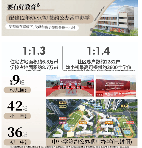 项目配建了一所9班规模的幼儿园,可满足社区内适龄儿童的学前教育需求。同时,还规划建设了42班小学和36班初中,总计提供3600个学位,学位数量甚至超过了业主户数,充分保障了业主子女的入学需求。更为值得一提的是,该项目已成功引进公办名校广东番禺中学教育集团进行办学,小学命名为“广东番禺中学教育集团兴南小学”,初中命名为“广东番禺中学教育集团兴南中学”,两所学校均已正式开学。