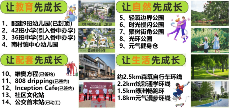 在教育配套上,我们引入广东番禺中学教育集团,打造九年一贯制学校,配备优质师资与完善教学设施,让您的孩子在家门口就能享受优质教育;在社区环境上,我们打造约2.5万㎡双公园,延续POD园林理念,构建全龄友好的社区景观,让您与家人随时享受自然惬意的休闲时光;在户型设计上,我们推出超100%使用率的全南向户型,最大化利用空间,满足不同家庭的居住需求。