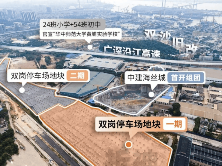 项目旁边中建海丝城配建万象汇,5 号线五站到三溪美林天地。距离双岗地铁站直线距离约 1km 的地块规划打造约 31 万㎡商业综合体,其中购物中心建面约 12 万㎡,将引入华润万象汇,是老黄埔第一个万象系商业。但大型商业需等二期和双沙兑现,且周边城市界面高度绑定双沙旧改发展进度。