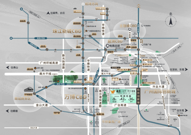 尽管越秀·大学·星汇锦城距离地铁7号线板桥站约3公里,步行时间较长,但小区提供了便捷的接驳服务,包括业主楼巴和公交线路直达地铁站。此外,家楼下设有公交车首末站,方便居民出行。自驾方面,兴业大道/南大干线等主干道串联万博CBD、广州南站等重要区域,南沙港快速、新化快速等则无缝连接珠江新城等地。