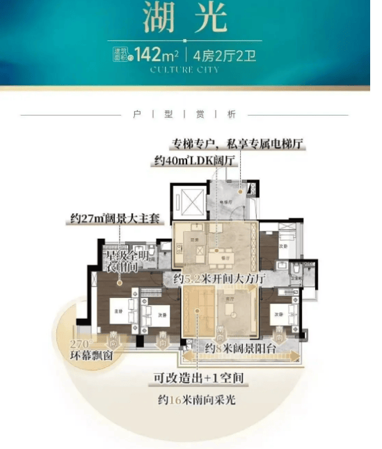 建面约143㎡四房:同样拥有约16米南向采光面,搭配约8米全景阳台,站在阳台即可俯瞰约1.2万㎡湖景,高层户型还能远眺江景,景观视野拉满。户型布局合理,南北对流,空间通透,每个卧室尺度充足,兼顾舒适性与私密性,适合注重景观与居住体验的家庭。