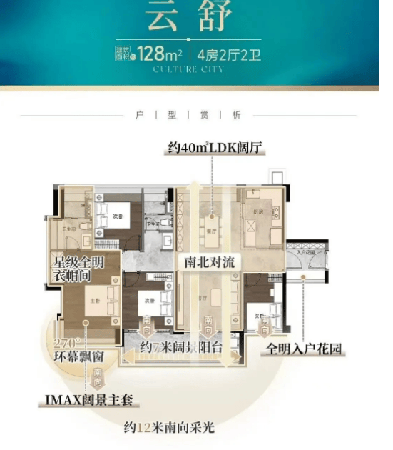建面约128㎡四房:该户型堪称同面积段产品的“碾压级”存在,拥有约16米南向采光面与南北对流设计,通风采光效果极佳。约40㎡LDK阔厅空间充裕,可满足家庭聚餐、亲子互动等多种场景需求,无论是日常居住还是招待宾客,都能彰显格调,适合追求空间质感的改善家庭。
