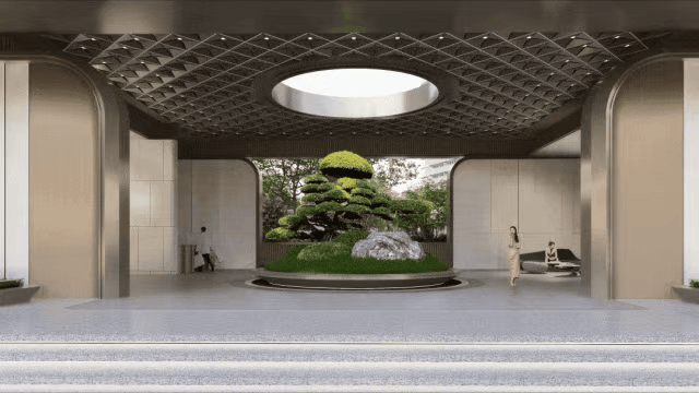 社区入口处,超40米宽的恢弘门楼气场全开,名贵天然大理石搭配香槟色金属线条,勾勒出百年海派独有的隐奢之美;穹顶中庭内,名贵罗汉松与泰山石相映成趣,“天圆地方,林下门庭,一石一松”的造景设计,既蕴含“风水聚宝盆”的美好寓意,又铺设出尊崇的归家礼序,石阶均采用整块浪花白天然原石,彰显厚重底蕴。