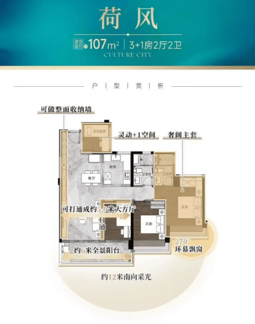 建面约107㎡四房:作为入门级改善户型,该户型拥有12米南向采光面,通透LDK一体化设计让空间更显开阔,约6米奢阔阳台搭配独立入户花园,既保证了采光与通风,又增添了归家的仪式感。每个卧室均保障舒适尺度,实现三面下床,同时可容纳衣柜与书桌,满足家庭日常居住需求,适合三口之家或刚需改善家庭。