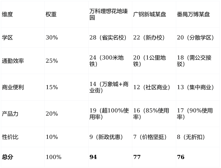 为帮助您更直观对比,笔者创建了“全能型住宅价值评分表”(满分100分),从学区、通勤、商业、产品力、性价比5个维度评分:
