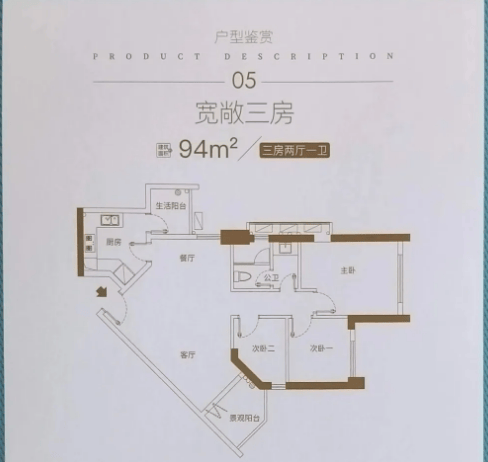 94㎡三房两厅一卫户型,是刚需家庭的优选户型。该户型布局方正,南北通透,通风采光效果极佳,客厅连接观景阳台,既能保证室内采光充足,又能让业主在阳台欣赏社区园林或周边景观。主卧与次卧空间宽敞,均能摆放1.8米大床及衣柜等家具,满足日常居住需求;书房空间灵活多变,可根据家庭需求改造为儿童房、储物间或办公区,提升空间利用率。厨房采用U型设计,操作空间充足,洗菜、切菜、炒菜动线合理,让烹饪更加便捷;卫生间干湿分离设计,有效避免潮湿问题,保持室内环境整洁。