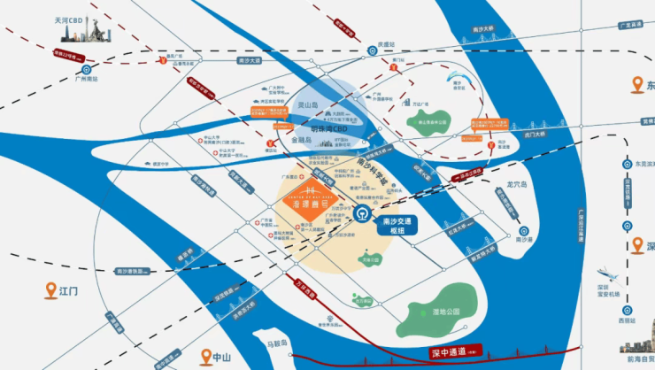 项目坐落于南沙万顷沙板块,地处南沙枢纽区块核心腹地,是粤港深度合作区与万顷沙综合生活服务区的交汇点。这里不仅是南沙未来城市发展的主战场,更是湾区内环快速通勤的关键节点。