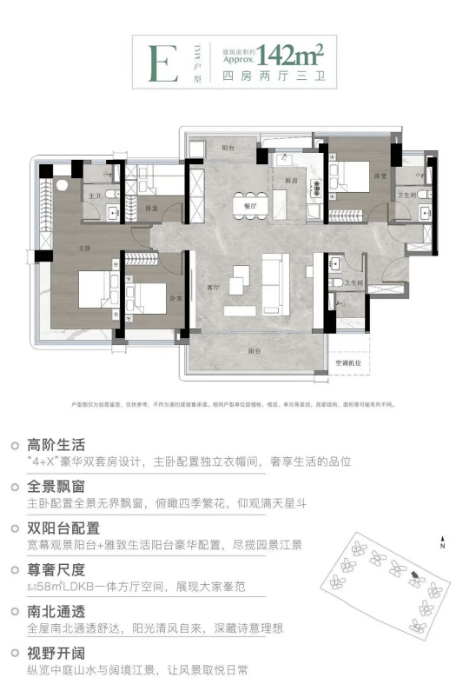 这些户型不仅面积合理,而且每一户都配备了大阳台,主卧室更是享有240度窗景,提升了居住舒适度。其中,改善型户型108-128-142平方米为三梯四户的超高层楼栋,南北通透,视野开阔。
