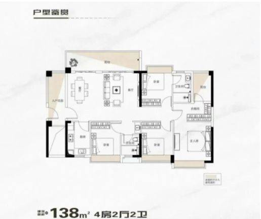 106-138㎡四房:横厅+双阳台,主卧套房配置,适合多代同住或改善升级。
