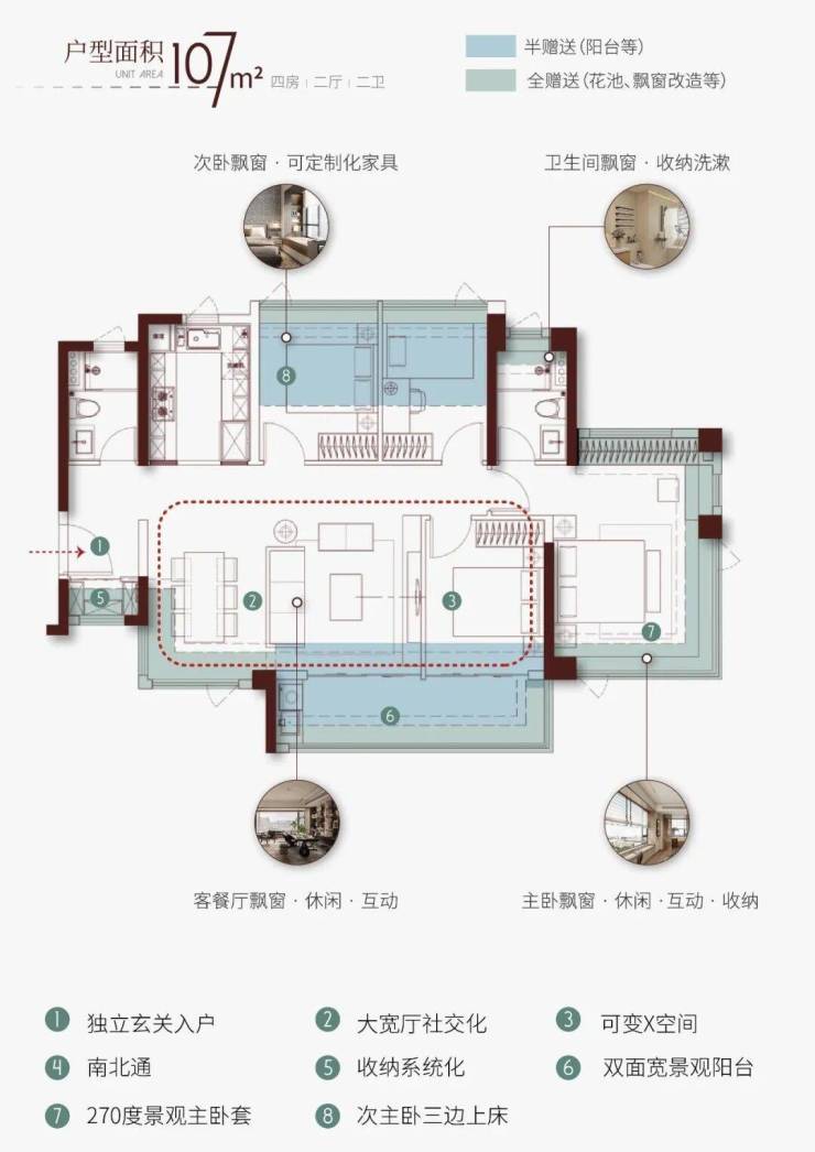 接下来是约107平方米的四房户型,这个户型专为追求更高品质生活的改善型家庭设计。4.5个开间朝南的布局,进一步提升了居住的舒适度。全天候的自然通风设计,使得室内空气始终保持清新,即使在炎热的夏季,也能感受到阵阵凉风。中心化餐厅的设计,让用餐成为家庭聚会的温馨时刻。灵活的X空间,则为家庭生活提供了更多的可能性,可以是孩子的第二书房,也可以是主人的私人影音室。270度观景主卧套房,是这款户型的点睛之笔。主卧套间化设计,不仅包含了独立的卫生间,还拥有一个巨大的观景飘窗,可以360度无死角地欣赏窗外的江景和城市风光。置身于此,仿佛整个世界都在脚下,那种豁然开朗的感觉,让人心旷神怡。套房化设计强化了舒适感,让主人拥有绝对的隐私和独立空间。这种精致的生活场景,正是现代都市精英所向往的。无论是周末的午后小憩,还是夜晚的静谧时光,270度观景主卧都能带给您无与伦比的享受。如果您对107平方米户型的布局细节、主卧套房的配置或是X空间的功能规划有深入了解的需求,请随时联系售楼处电话:400-062-8010,我们将为您安排专门的讲解员,带您细细品味每一处设计的用心之处。