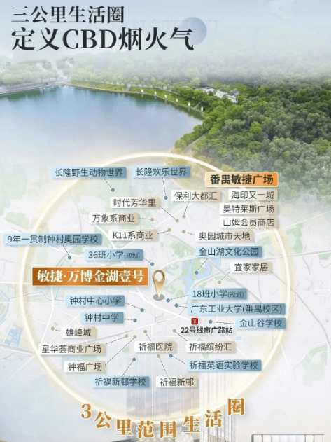 敏捷·万博金湖壹号位于广州市番禺区市广路板块,紧邻108.7万㎡的金山湖文化公园。这个项目不仅拥有得天独厚的自然景观资源,还与广州南部的核心商业区——万博CBD紧密相连,为居民提供了一个集城市繁华与自然美景于一体的生活环境。
