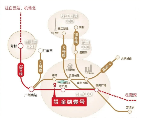 敏捷·万博金湖壹号交通便捷,出门即达地铁22号线市广路站,通过该线路可快速抵达广州南站、万博CBD以及珠江新城等地。自驾方面,新光快速、广台高速等“五纵五横”立体交通网络确保了业主能够迅速连接广州各核心城区。