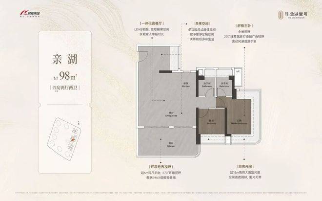 敏捷·万博金湖壹号位于金山湖生态公园的核心位置,坐拥千亩中央公园级别的生态环境。北瞰金山湖、南望大夫山,为居民提供了独特的湖光山色美景。低至3.21的容积率营造了一个低密度、舒适的生活环境,远离喧嚣,享受宁静与私密的生活氛围。