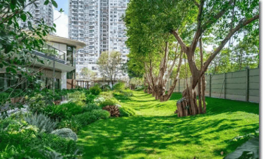 社区园林是项目一大亮点,复刻余荫山房的岭南园林风格,打造层次丰富的景观空间。园林内设有洗钵池水景,寓意“鱼跃龙门”,搭配绿植、假山、花窗等元素,营造雅致的中式意境。同时,园林内多数绿植具备驱蚊、养生功能,还专门开辟一处药圃,种植各类养生食材,满足老广煲汤需求,让园林不仅好看,更具实用性。