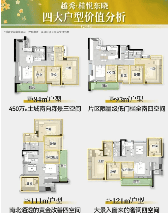 【Q1:越秀·桂悦东晓的户型使用率到底有多高?】A1:项目户型使用率位居海珠目前全部在售新盘前列,得益于新规设计与精细化布局,建面约84-121㎡户型均实现超高空间利用率,比同面积段传统户型多出更多实用空间。例如建面约93㎡户型可打造四空间,建面约111㎡户型实现4.5个南向开间,最大化提升空间利用率,满足家庭多元需求。