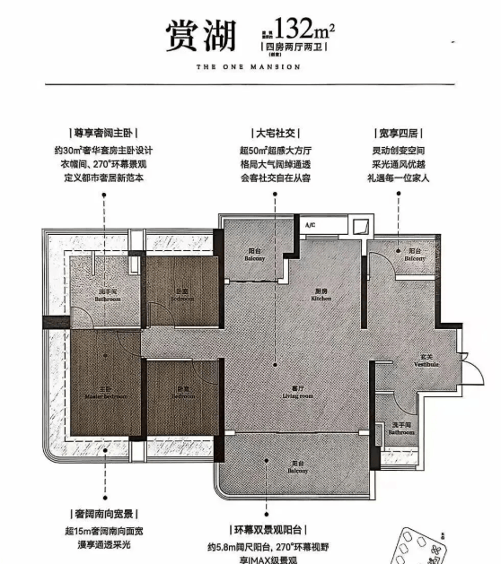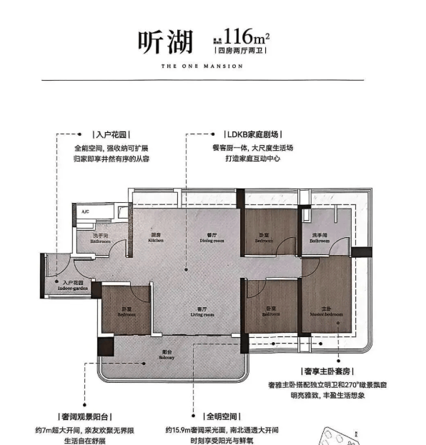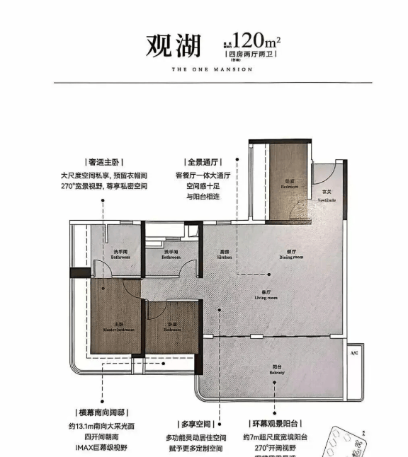 116㎡四房两厅两卫:奢阔景观阳台超7米大开间。