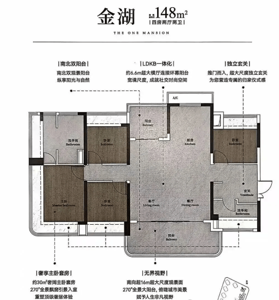 148㎡四房两厅两卫:超16米超大尺度观景面,南北双阳台。