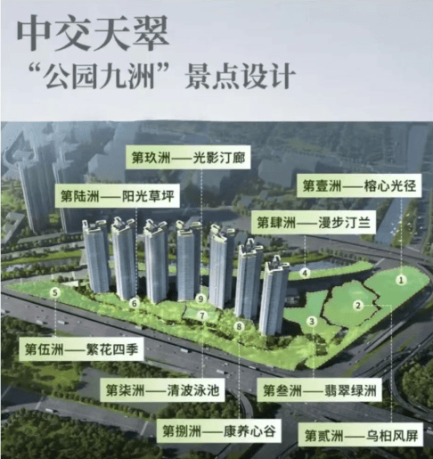 中交天翠占地面积约为6.7万平方米,其中仅3万平方米用于建设,其余部分则为绿地和道路用地。项目总建筑面积约15.2万平方米,规划有7栋高层住宅楼,每栋楼高44-48层,共提供1445套房源,容积率为5.02(含公园面积),绿化率达到36.75%。小区内部设计了七大运动主题大花园,总面积达7.2万平方米,为居民提供了丰富的休闲空间。