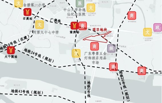 项目地处海珠区老城区,生活氛围浓厚,周边商业配套成熟,百万方商业环绕,如海珠城光荟、广州之窗商务港、广百海港城、海珠万达广场等。此外,项目自带1800平方米风情商业街,满足居民日常购物需求。