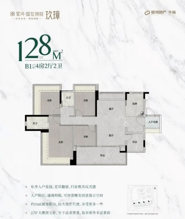 128㎡户型:独立入户花园设计,厨房、客餐厅和主卧尺度大幅提升,带来豪华尊崇享受。