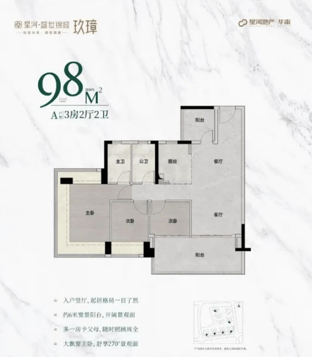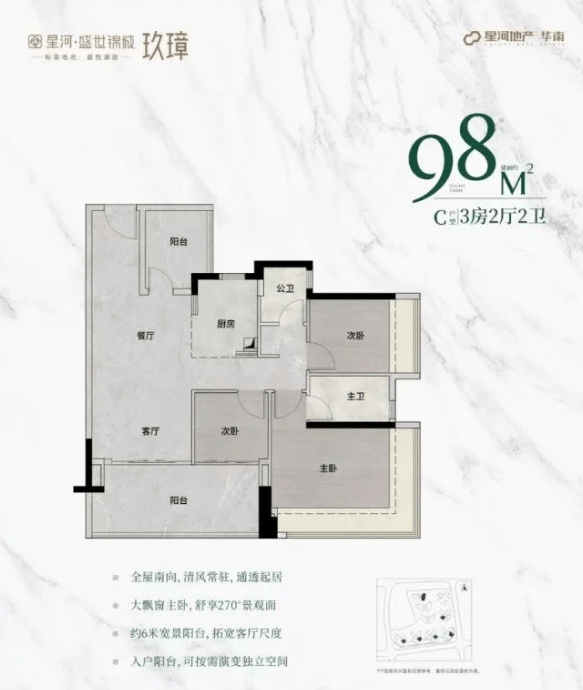 98㎡户型:主朝向朝南,配备270°无柱飘窗,视野开阔,次卧和阳台尺度大幅增加。