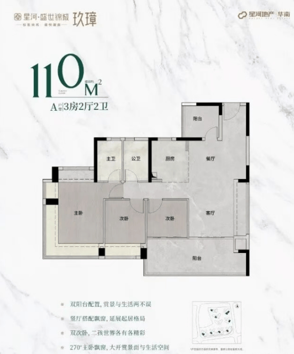 110㎡户型:主朝向西南,客厅、阳台和主卧尺度全面超越二期,空间更加开阔大气。