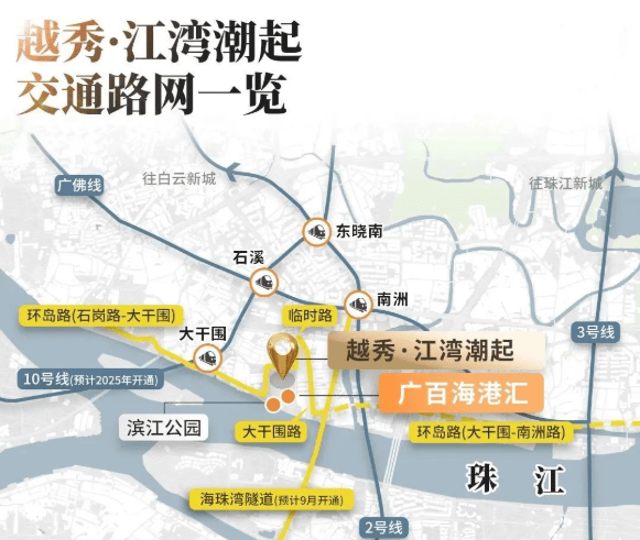 项目位于珠江后航道南岸,直线距江边仅约200米,坐拥约1.7万㎡滨江公园,日常可享垂钓、露营、环江慢跑等滨水生活。交通方面,距离地铁10号线大干围站约650米,4站直达滨江东,6站通达珠江新城、体育西等核心商圈。未来还将通过在建的海珠湾隧道,15分钟直达广州南站,大幅提升湾区通勤效率。