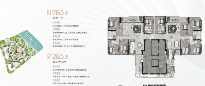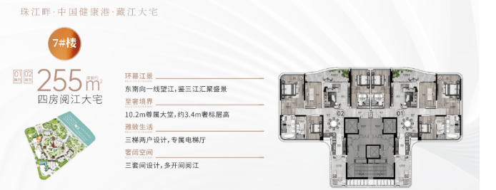 而255平方米的东南向一线阅江户型,则以其独特的东南向朝向和宽敞的居住空间而备受瞩目。该户型同样采用了大面宽、短进深的设计理念,确保了室内空间的宽敞明亮。客厅和主卧均朝向东南向,既能享受到充足的阳光照射,又能欣赏到绝美的江景。而客厅与阳台相连的设计,则让业主在享受室内舒适环境的同时,也能感受到室外的自然美景。此外,该户型还设有独立的衣帽间和卫生间,提高了业主的居住品质。