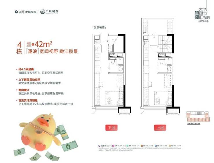 保利金沙大都汇主要推出建面约30-42㎡的小户型产品,每套房子高度约为4.5米,采用复式设计,并且上下两层可独立入户,实现双钥匙管理。这种设计不仅增加了空间利用率,也为投资者提供了更多的可能性。