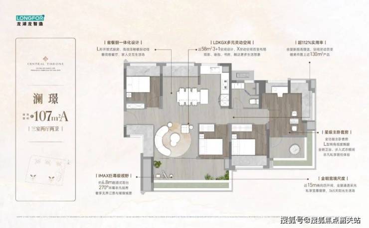 92㎡三房两厅两卫:22cm超窄飘台设计,赠送面积达12㎡,配备双开门冰箱位、270°转角窗,总价335万元起。