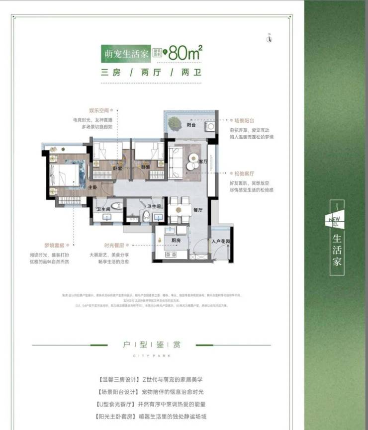 户型: 78㎡三房起,高得房率,空间灵活;