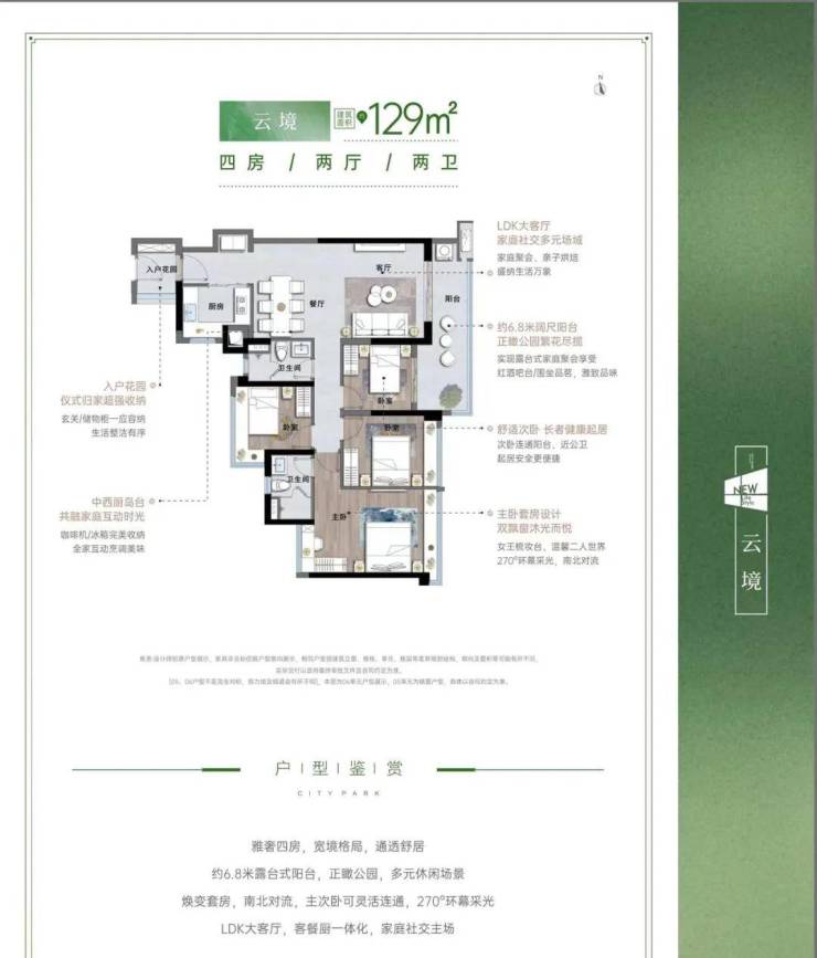 138㎡四房: 7.2米景观阳台直面中央公园,双主卧设计,适合三代同堂。