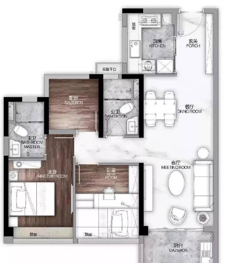 这个户型比较经典实用,是三房两厅两卫设计,并带主套,刚需客可以一步到位。