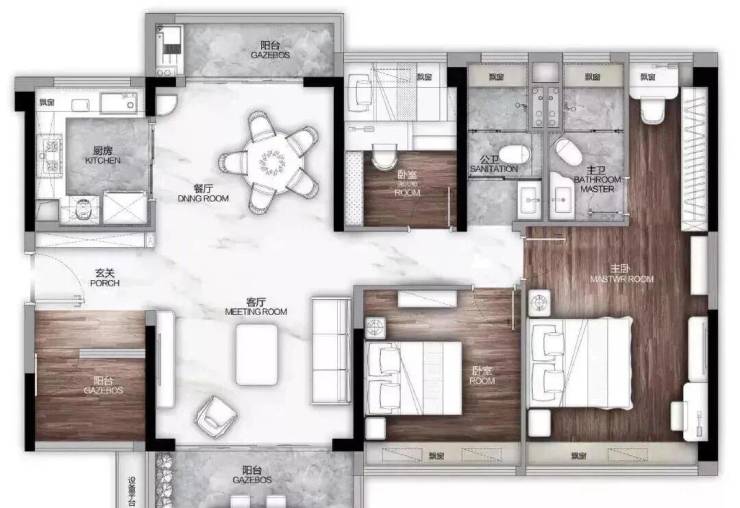 此外,餐厅、客厅还与两个阳台相连,可打造出一个“全面屏”大厅,无论是待客、休闲还是家庭欢聚,都能很好容纳。